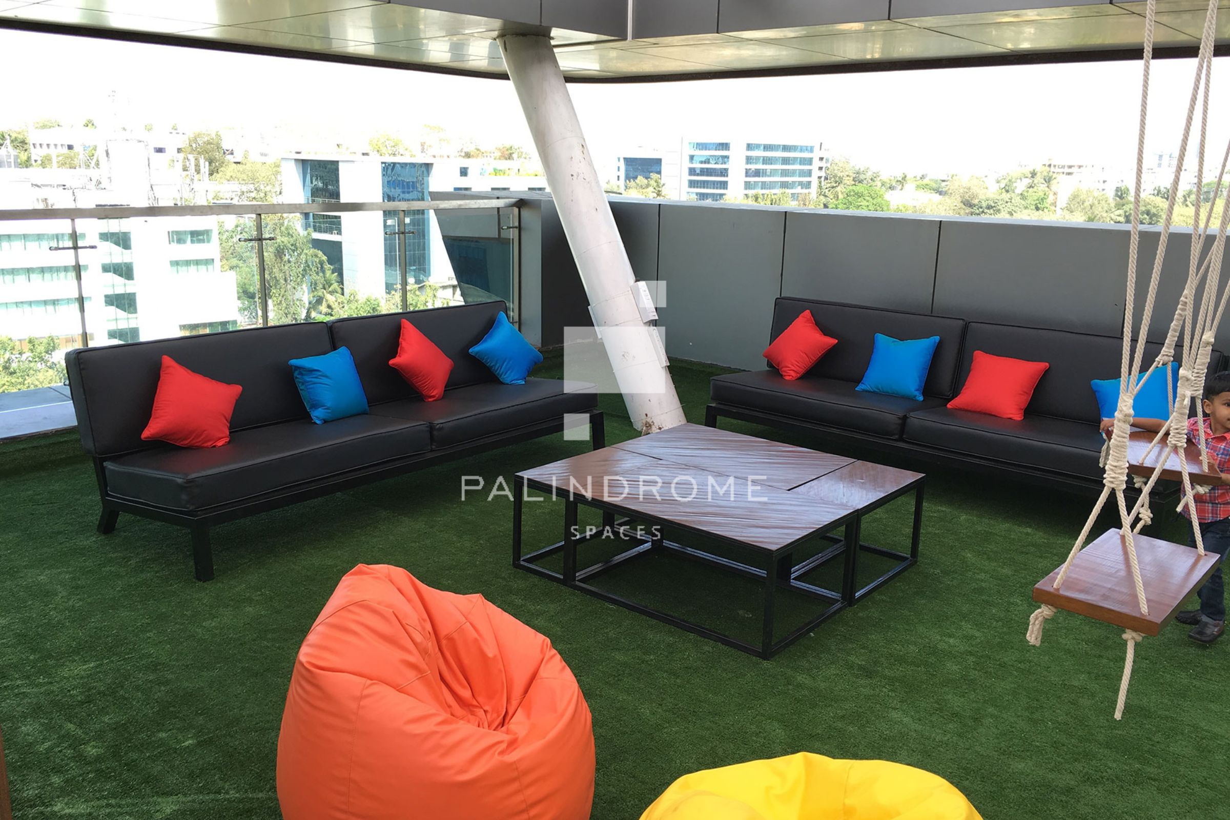 Swinging into Discussion – a conversation-inducing Seating Nook makes for a lively space in the Co-Working Space setup. The ideal niche for the downtime one needs at work to brainstorm and really get the creative juices flowing, with its brightly coloured upholstery and comfy lounge seating with the addition of a boho style swing.